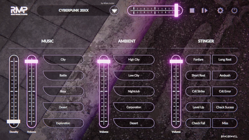 In the application it is possible to load different themed packages called “Dimensions”. Each one has 5 musical themes, 5 ambient sounds and 10 stingers (short sounds for pontual and important moments in the narrative). Every “Dimension” explores a specific subgenre that exists into a broader context like Dungeons and Dragons, Cyberpunk and Call of Cthulhu. All directed to the universe of Role Playing Games and to storytellers, our main public.